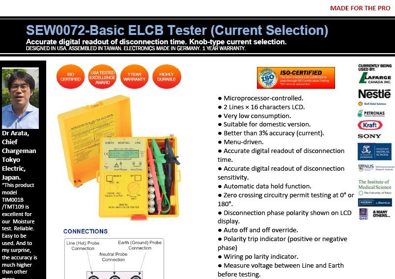 System voltage (50Hz / 60Hz) 550V 380V 240V Current settings 2-999mA ac Current selection Knob Phase start selection 0° and 180° Over-temperature Yes Wiring correction Yes Phase polarity trip indicator Yes Operating voltage (L-E) 110 Vac to 317 Vac Timer resolution 1ms (Max. Time=19.999s) Timer accuracy 1ms ±1ms Current accuracy ±1% ±1mA Current resolution 1mA Voltmeter accuracy (50Hz) 50-350 Vac : ±2%±1V Voltmeter resolution 1V Voltameter resolution ±2%±1Vac Operating temperature -5°C to 40°C Storage temperature -10°C to 55°C Dimensions 170(L) × 165(W) × 92(D)mm Weight (battery included) Approx. 1300g Power source 1.5 (AA) × 8