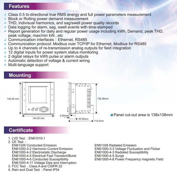 • Smart Power Meter with up to 4 channels of re-transmission analog outputs for field integration.