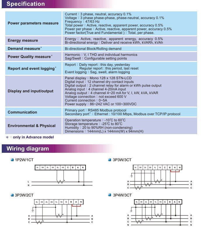 • Communication protocol:Modbus over TCP/IP for Ethernet, Modbus for RS485.